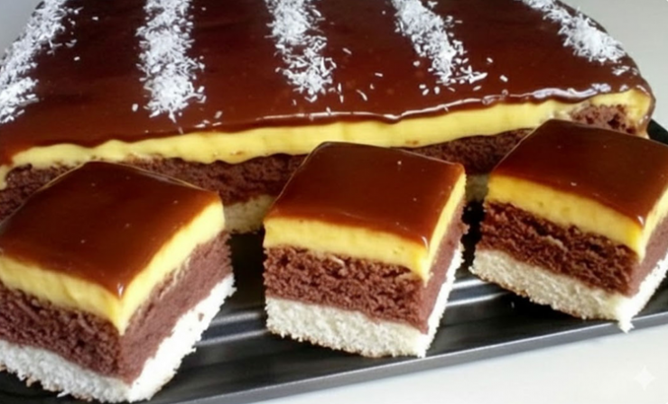 Această prăjitură este una dintre cele mai apreciate combinații: un blat ușor din cocos, unul pufos din cacao, o cremă fină galbenă și o glazură bogată de ciocolată. Nu doar că arată minunat, dar gustul este absolut irezistibil. Deasupra poți presăra nucă de cocos pentru un aspect elegant și un plus de aromă.
