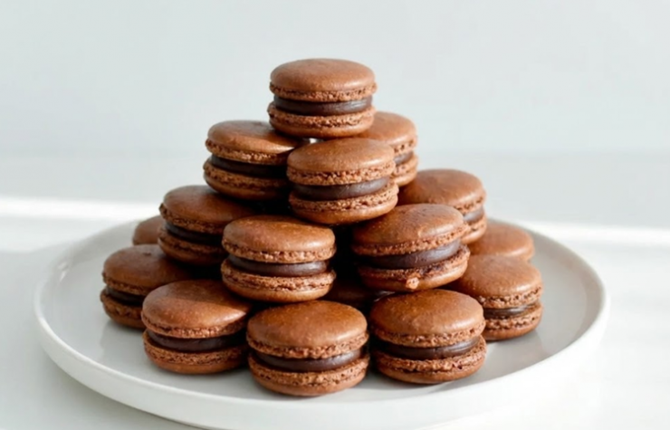 Macarons sunt unele dintre cele mai elegante deserturi franceze: mici, delicate, cu o coajă crocantă la exterior și o textură moale și ușor gumată în interior. Fotografia surprinde minunat câteva macarons perfect rotunde, umplute cu o cremă fină de ciocolată – exact cum ar trebui să arate un desert reușit, făcut cu grijă și pasiune.