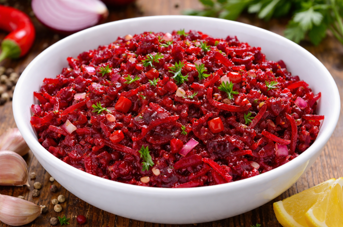 Această salată de sfeclă roșie cu ceapă, usturoi și ardei iute este simplă, sănătoasă și plină de gust — o combinație perfectă între dulce, acrișor și picant.